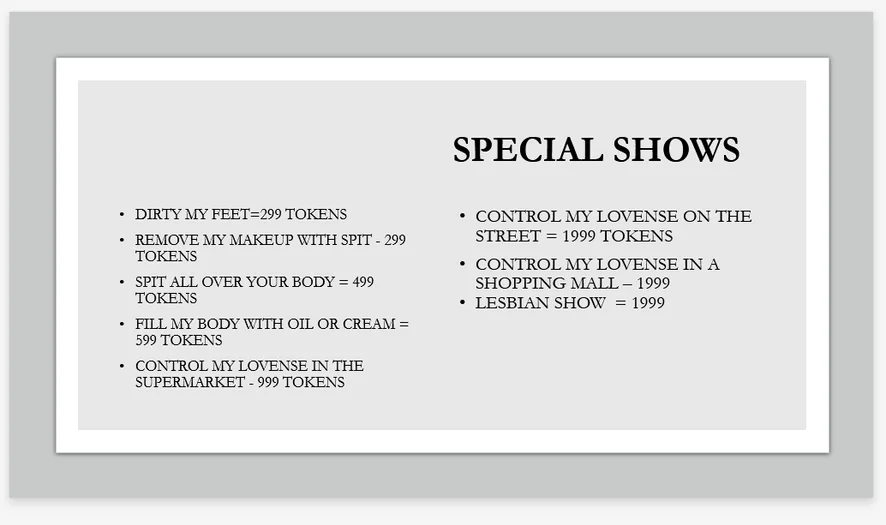 139 tokens = Deepthroat​ 149 tokens = Rub ice on my tits​ 149 tokens = Rub ice on my pussy ​ 159 tokens = Bounce my big tits​ 169 tokens -= Bite my nipples​ 179 tokens -= Ride your cock​ 189 tokens = Bang my pussy for 30 sec​ 189 tokens = Finger bang my ass for 30 sec​ 199 tokens = Open my pussy wide for 30 sec​ 199 tokens = Open my ass wide for 30 sec​ 299 tokens = Huge dildo in pussy or tits​ 666 tokens = Creamy and Cum show ​ 999 tokens = Big squirt ​ 1999 tokens = Big Orgams​ 2999 tokens = Full show ​ 3999 tokens = Used panties soaked with my pussy juices, delivered anywhere in the world